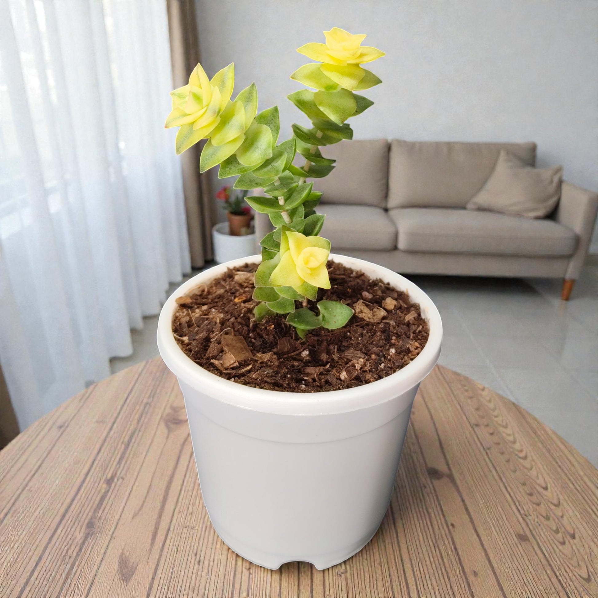 Crassula Perforata Variegated, commonly known as the Variegated String of Buttons, is a beautiful succulent with stacked triangular leaves in soft green, creamy white, and yellow shades. When grown in bright light, the leaf edges often develop a subtle pink or reddish blush, adding to its decorative charm. Its upright-to-trailing growth makes it ideal for shelves, tabletops, hanging planters, and office desks.