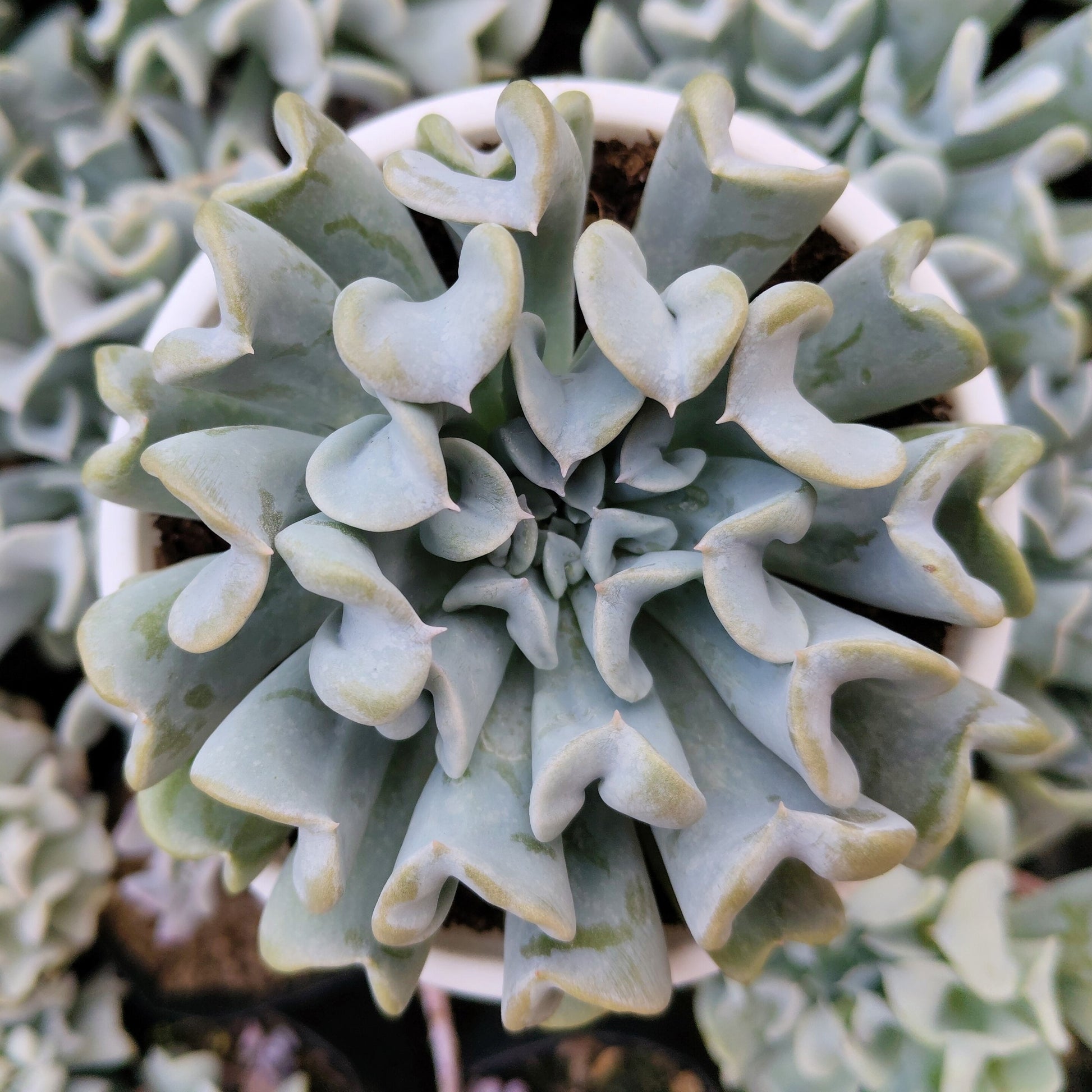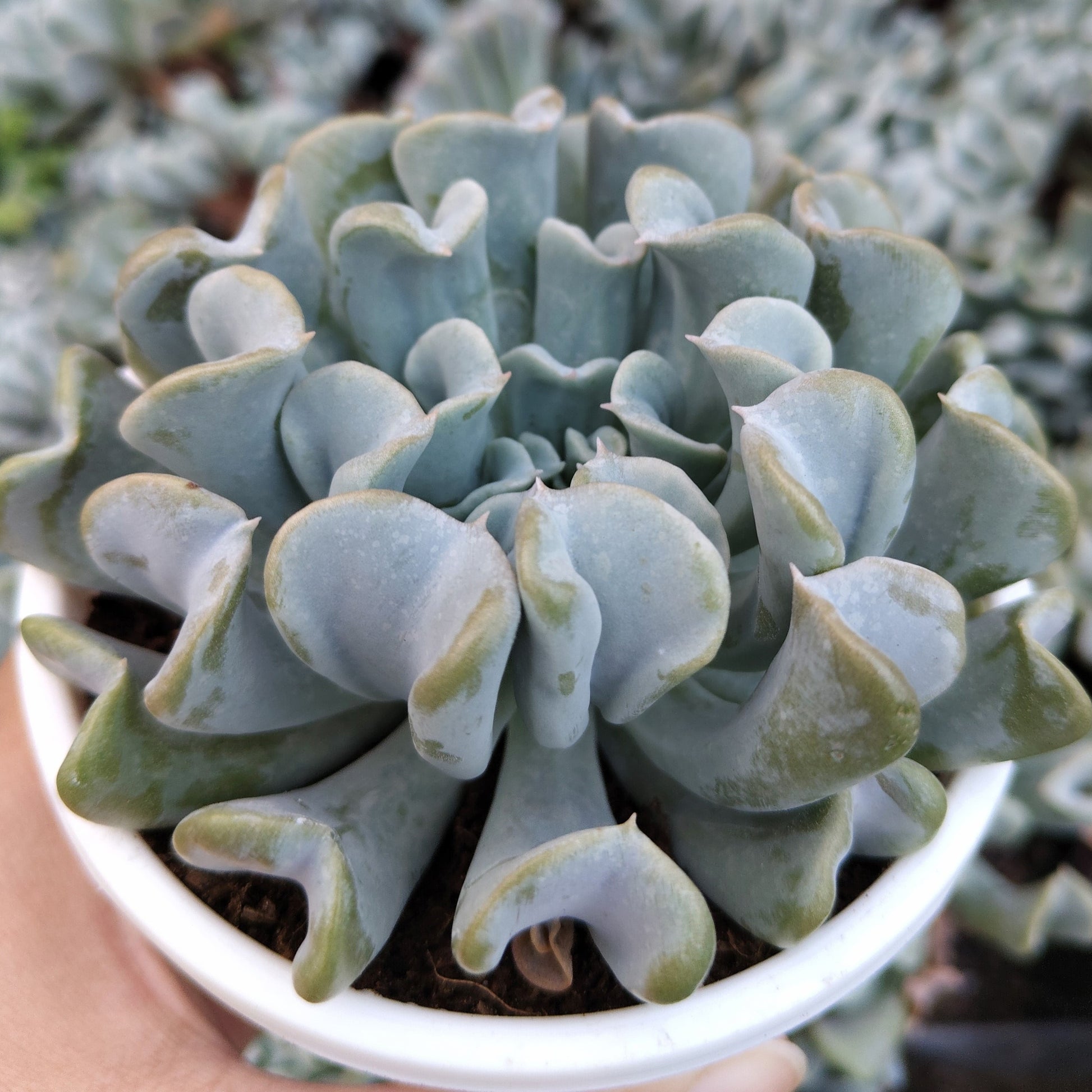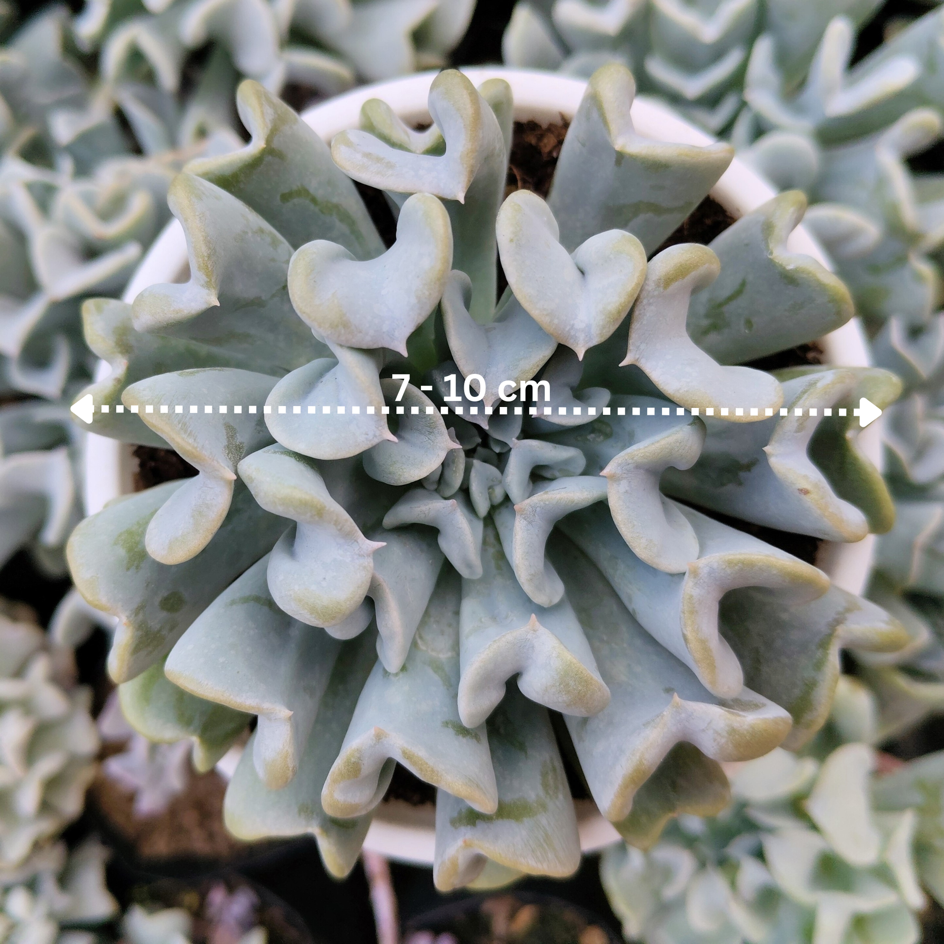 - Distinctive curved blue-grey leaves forming a unique sculpted rosette